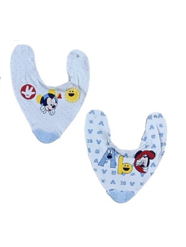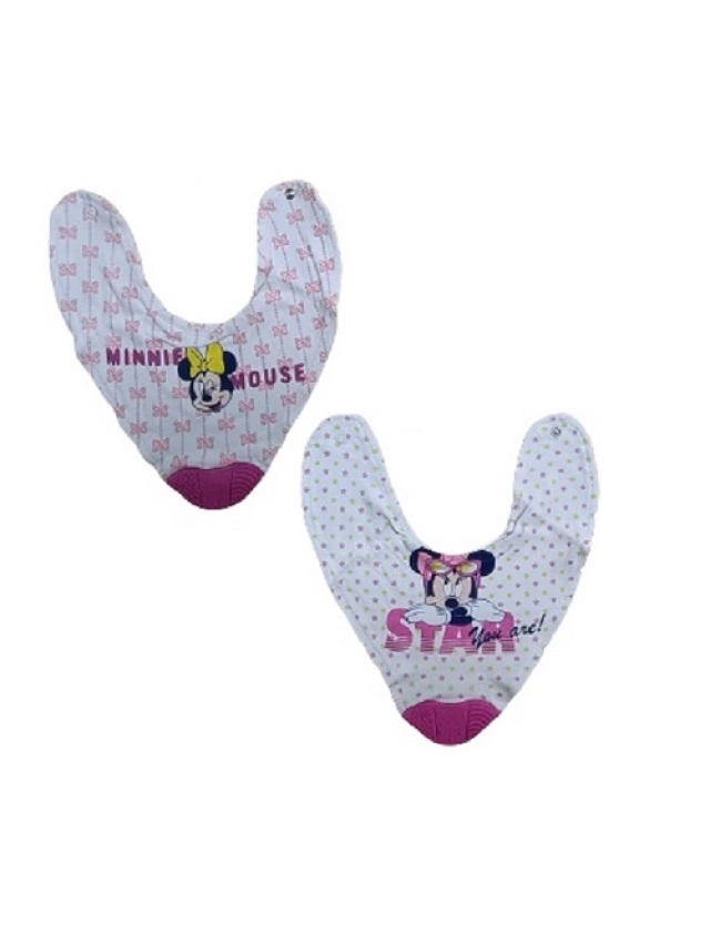 - Pack 2 bandanas con mordedor en la punta, estampados por dibujitos de Minnie Y Mickey Mouse, con cierre de botón.