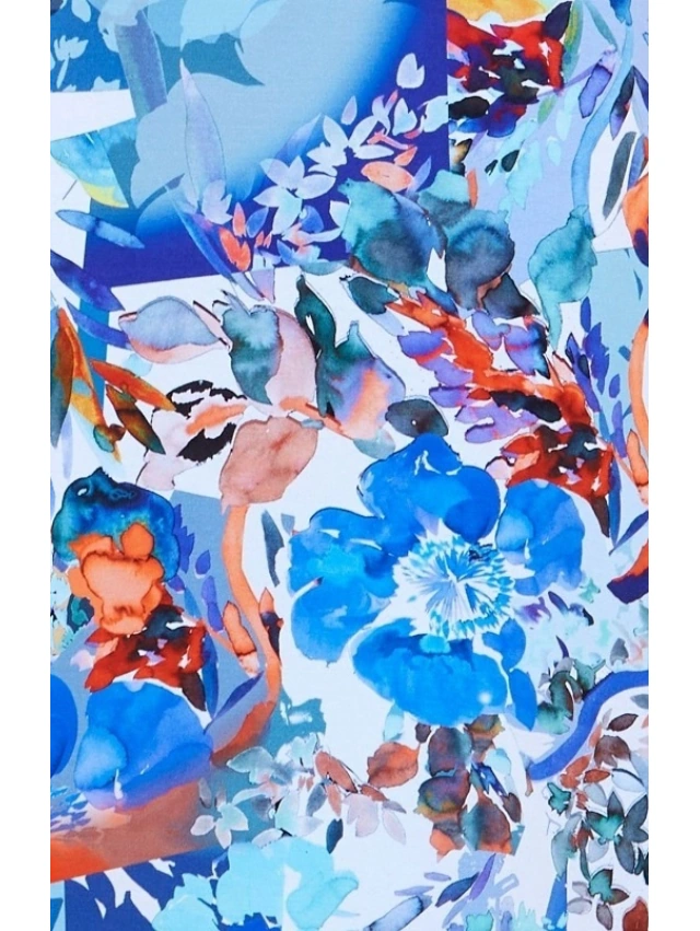 - Vestido de playa con un favorecedor estampado en tonos azules y naranjas.