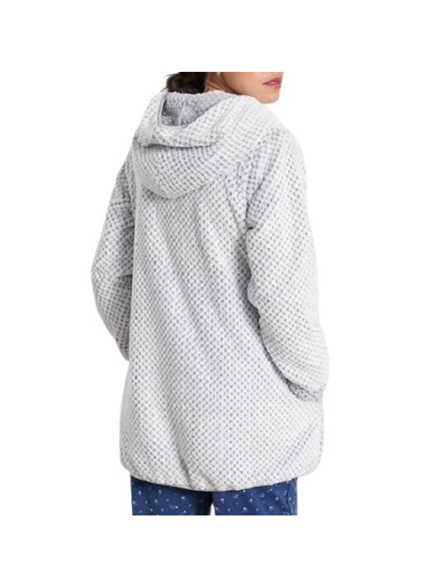 - Modelo en color gris claro con capucha.