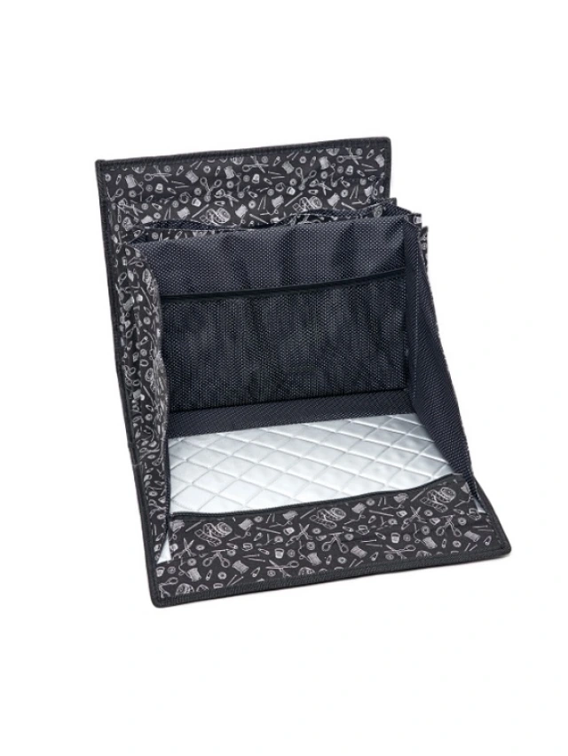 - Una solapa plegable con una alfombra de planchado acolchada, perfecta para acolchar y prensas rápidas.