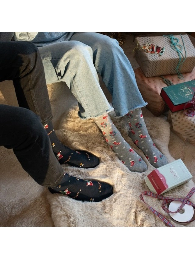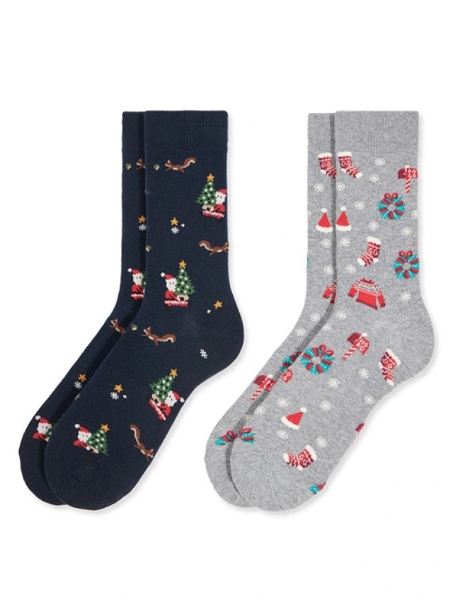 - Calcetines de algodón con diseños navideños en marino y gris.
