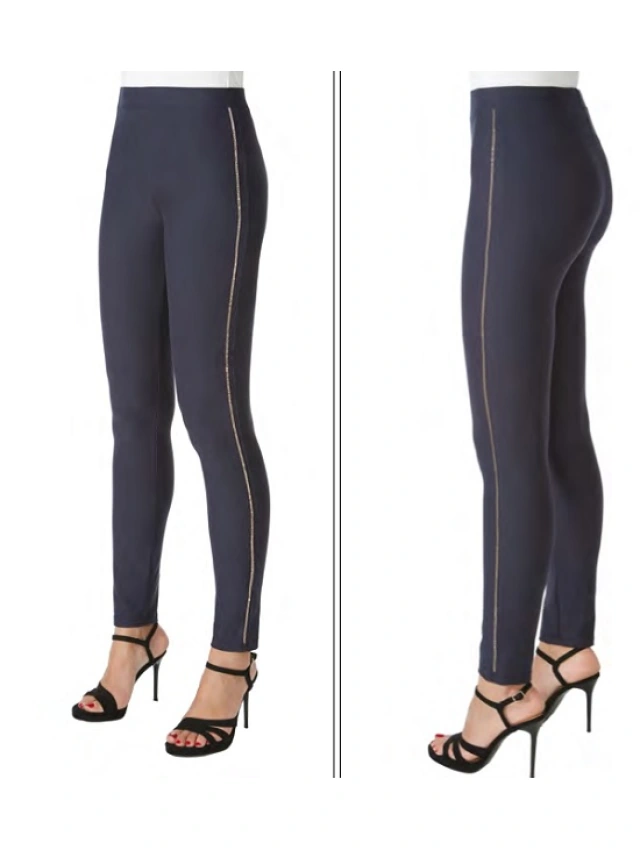 - Legging en tejido punto milano, diseñado con una moderna tira lateral de pedrería dorada en la pierna.