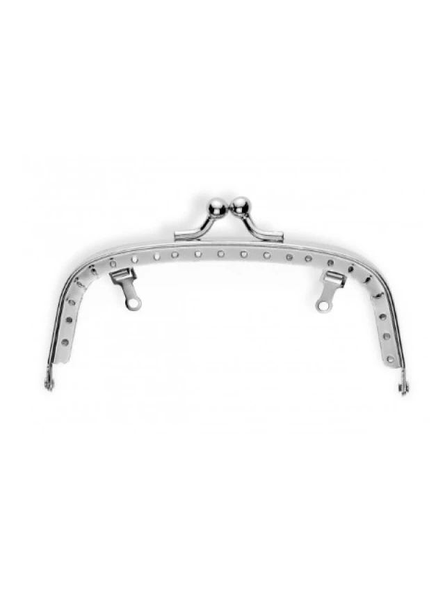 Descripción: Boquilla monedero, color plata de 12 cm. - Incluye gancho para mango de bolsa. - Agujeros pre-perforados para la costura de la tela. - Con instrucciones de costura y contorno de corte. - Medida: 12 cm - Color: plata.