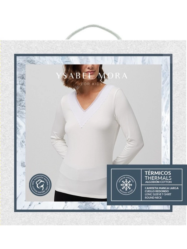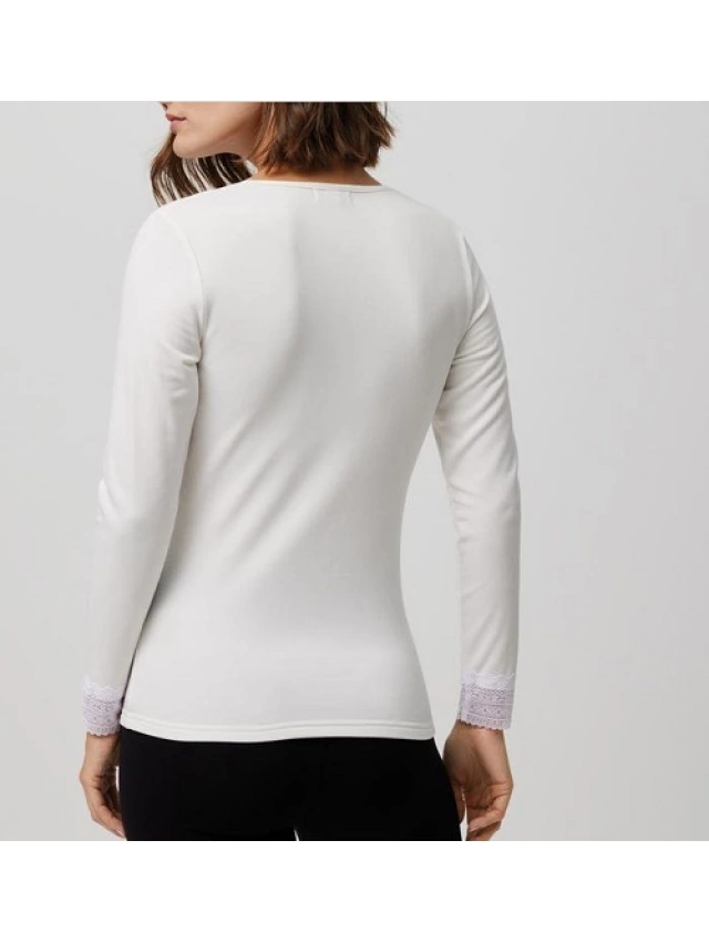 - Camiseta térmica de manga larga para mujer con cuello en pico y detalle de ribete de encaje en cuello y manga.