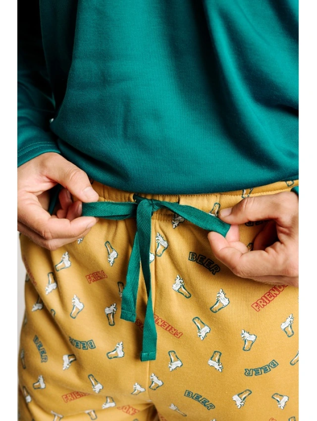 -El pantalón es de color amarillo con un estampado repetitivo de motivos relacionados con la cerveza.