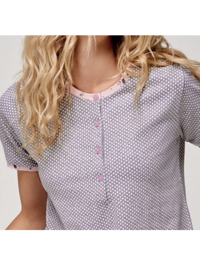 - Diseño de camiseta de manga corta con cierre con botones en el escote y pantalón corto.