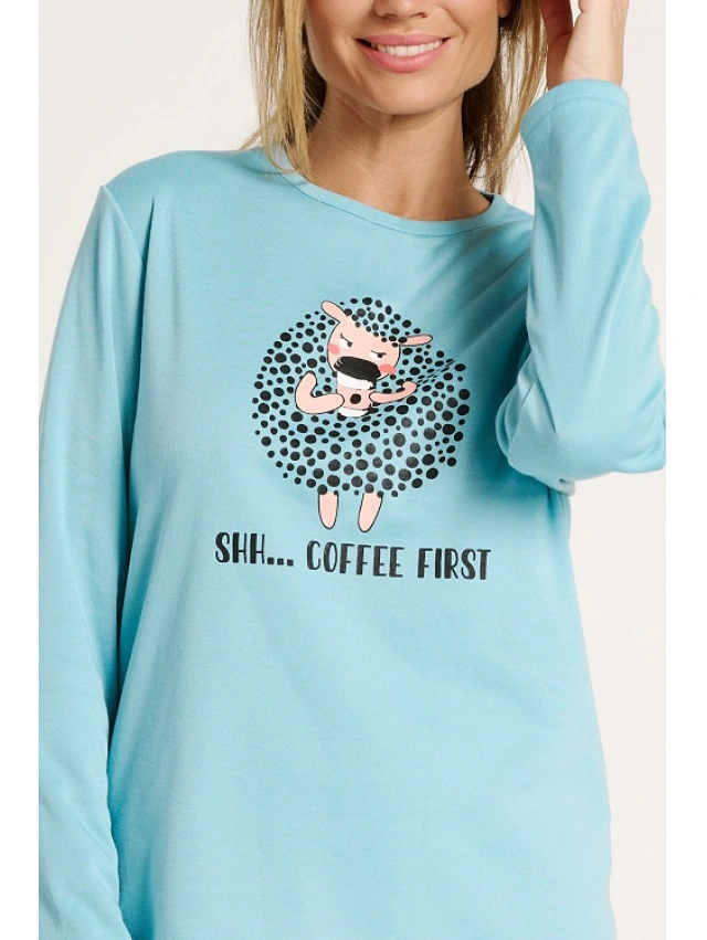 -Camiseta de manga larga en color turquesa. Presenta un estampado central de una oveja .