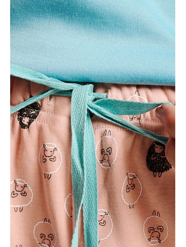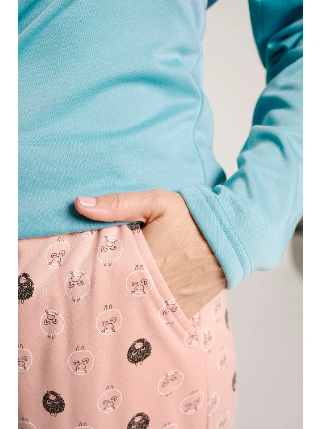 -Pantalón largo con puño en color rosa, con un estampado repetitivo de ovejas.