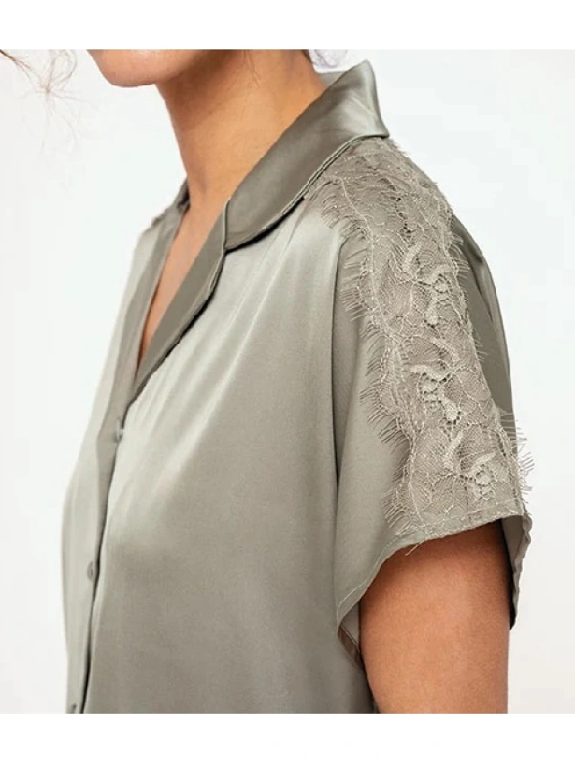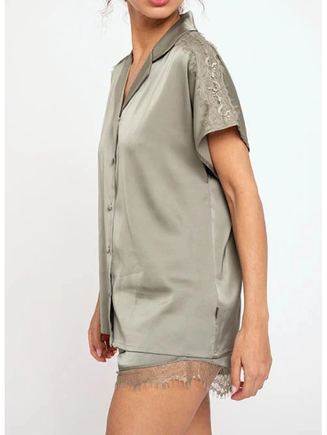 - Conjunto de pijama verde en tejido satén, compuesto por una camisa de botones de manga corta y un pantalón corto.