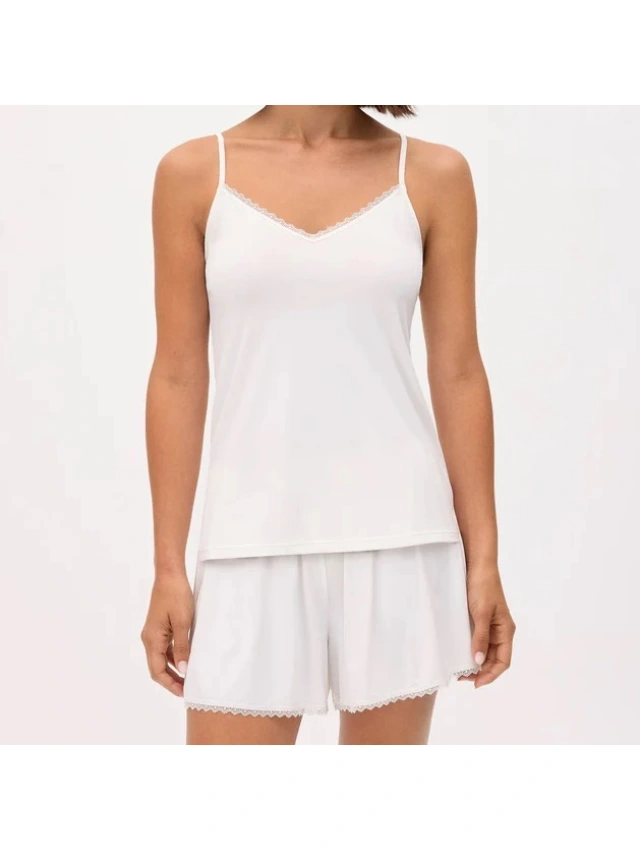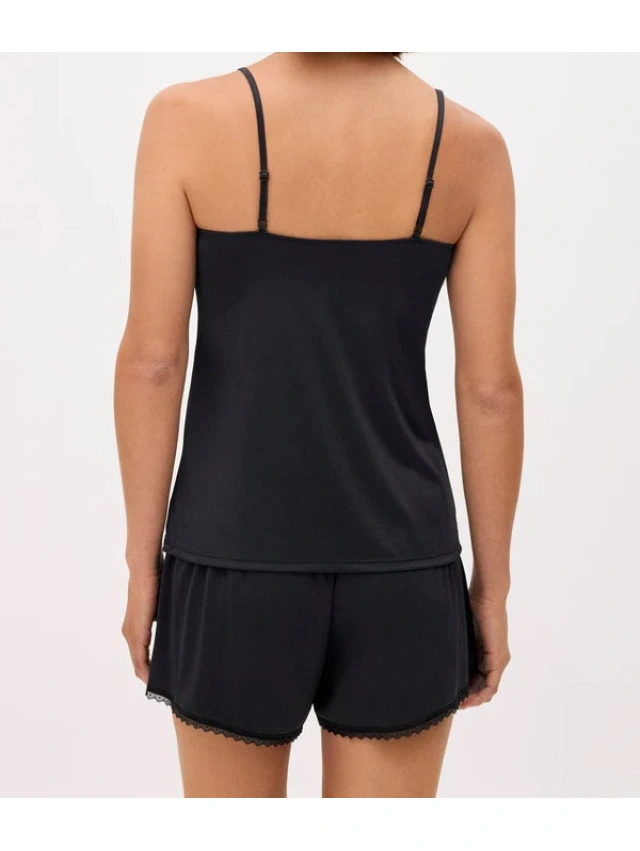 -Conjunto de pijama de lencería con camiseta de tirantes y pantalón corto, todo decorado con detalles de encaje.
