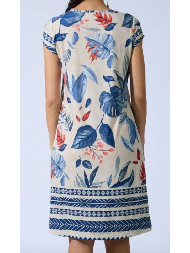 - Favorecedor diseño floral con predominantes tonos azules y una elegante greca en el bajo.
