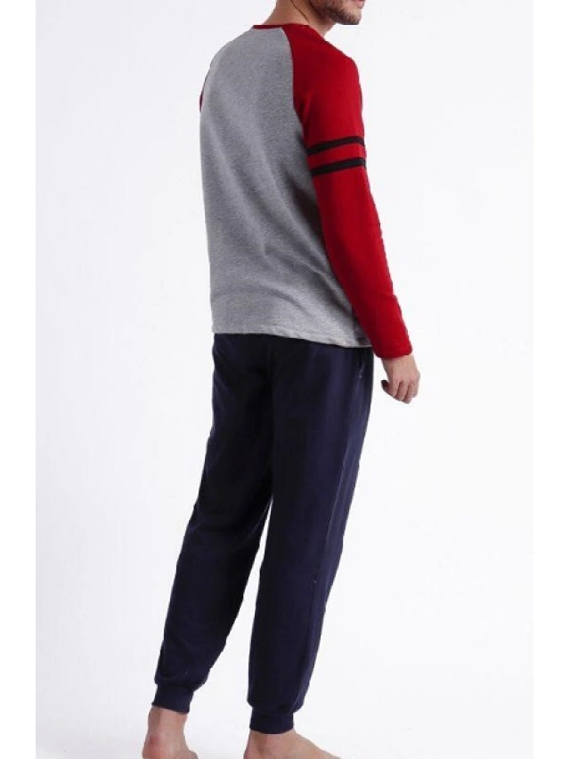 - La camiseta es gris jaspeada con las mangas en granate y una estampación de Mickey y el pantalón es liso en negro con goma en la cintura y cordón en granate.