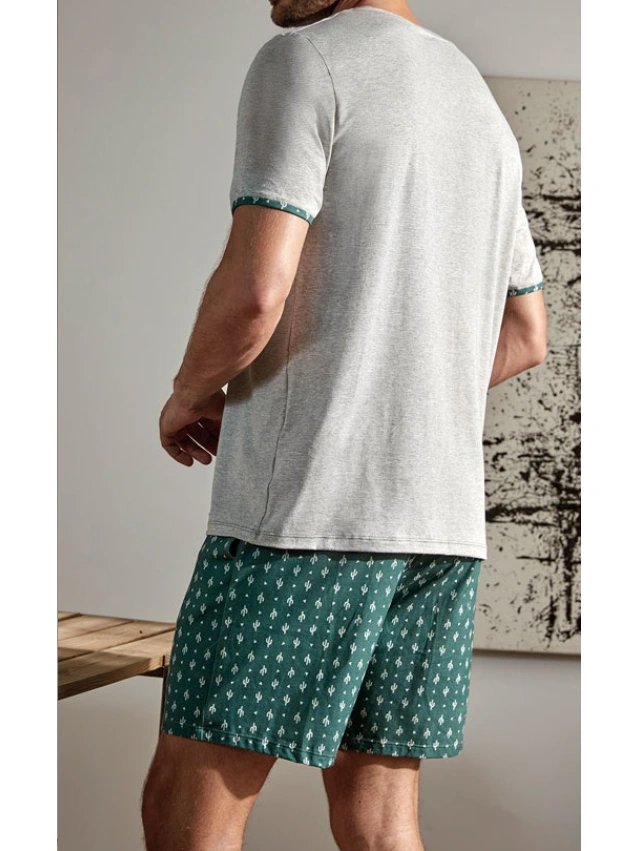- Cómodo pantalón con microestampado de cactus grises sobre fondo verde, con bolsillos y cintura elástica.