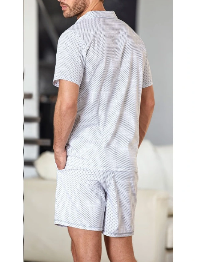 - Pijama camisero todo en plana elástica, compuesto por top tipo camisa y pantalón de plana estampado.