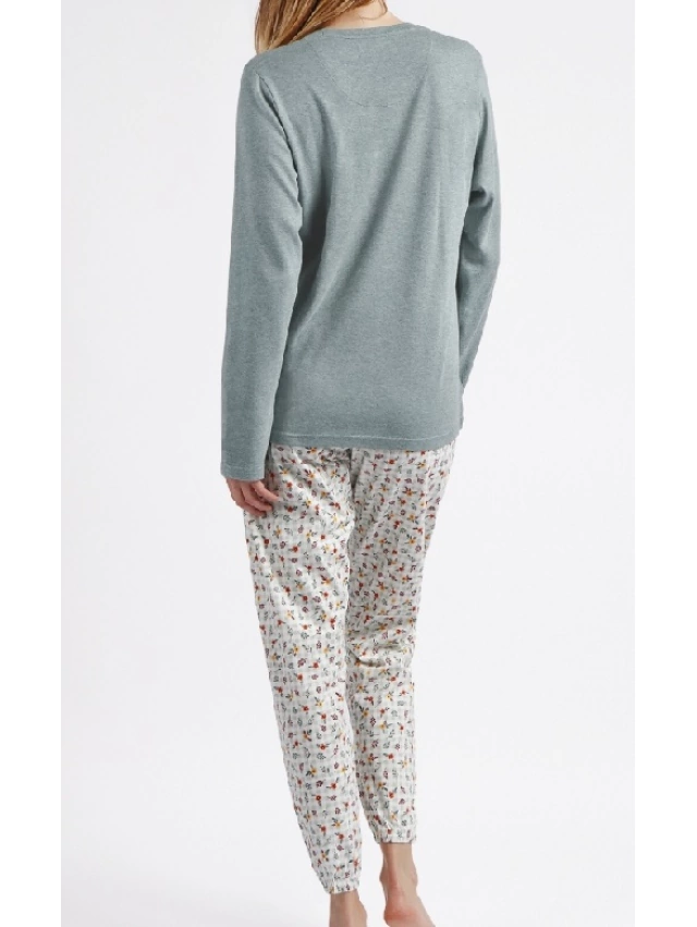 Descripción: - Pijama de punto de algodón, de manga larga, cuello con tapeta con botones y pantalón largo. - Camiseta de punto liso, de color verde hoja, con bolsillo. - Pantalón de punto estampado con cinturilla ajustable. - Tejido suave al tacto. - Composición: Camiseta: 50% algodón, 50% viscosa. Pantalón: 100% algodón