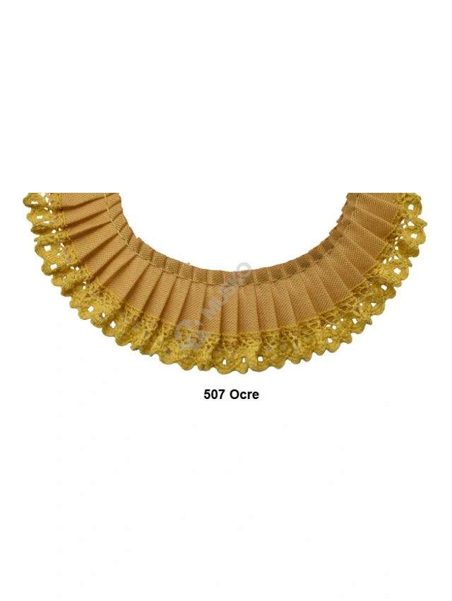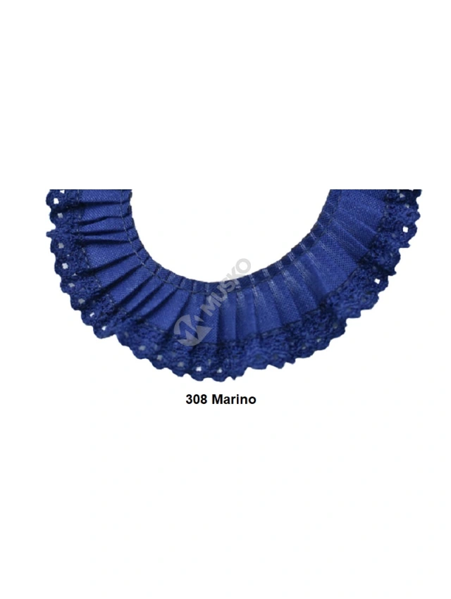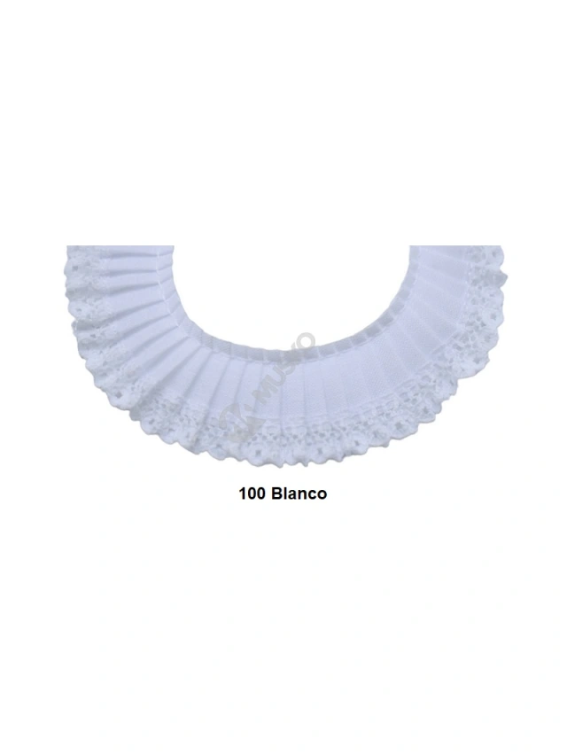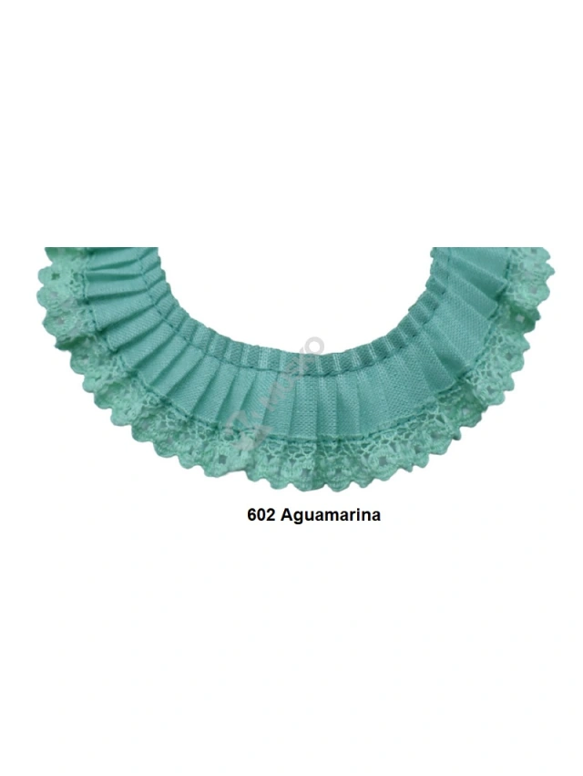 - Cinta plisada en un lateral y en el otro extremo puntilla de piquillo y con 2,7 cm de ancho aprox.