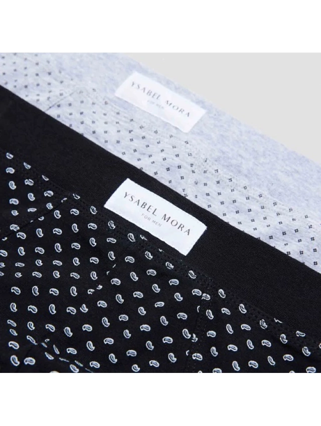 - Cada pack incluye un calzoncillo de color gris y otro de color negro, ambas con estampado.