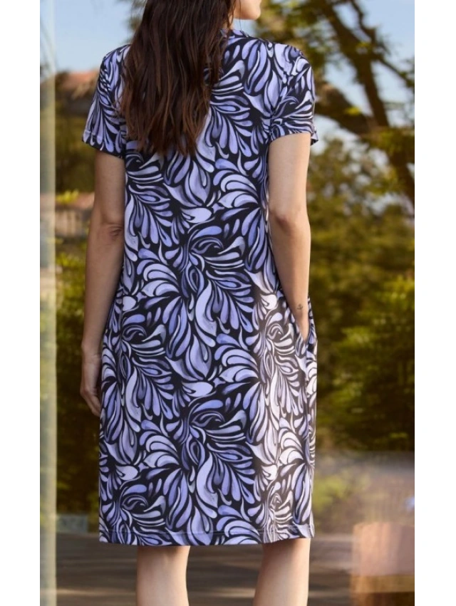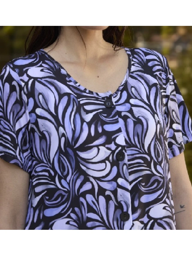 - Tejido con estampado abstracto en favorecedores tonos morados.